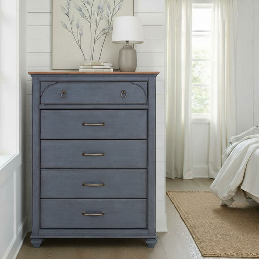 View full detailsFive drawers Felt lined top drawers Wood Type: Rubber Solids and Birch Veneers Hardware: Antique Pewter No Assembly Required Chest - Blue...