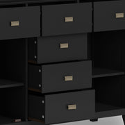 - Features six (6) central drawers with metal glides, and two (2) side doors with tempered glass that open to large storage spaces with one (1) shelf each.