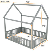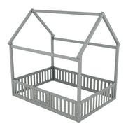 Wood House Full Bed With Fence And Door - Gray