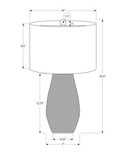 - Design & Style: Contemporary 24" table lamp with a grey resin base featuring a raised, dotted texture and an ivory fabric drum shade for a boho-glam look.