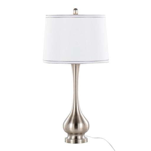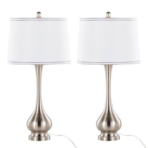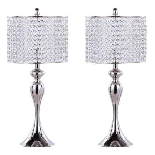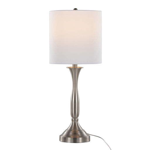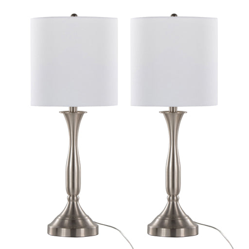 View full detailsStylish Design: This set includes two contemporary accent table lamps with a sleek nickel metal finish and simple ivory fabric cylinder drum shad...