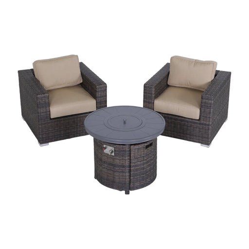 View full detailsComplete 3-Piece Set: Includes 2 deep seating wicker armchairs, 1 propane fire pit, 4 cushions, and a fire pit cover. Stylish Fire Pit: Charcoal c...
