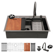 33" Single Bowl Kitchen Sink With Waterfall Flow, 16 Gauge T 304, Ledge Workstation, Top Mount - Gunmetal Black