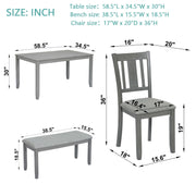 - 6PCs Dining Set for Family Gatherings: Includes a dining table, four upholstered chairs, and a bench, comfortably seating six people. Space-saving design allows chairs to slide under the table, ideal for compact areas.