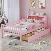 Twin Size Bed With Headboard Storage Rack, 2 Under Bed Drawers, 3 - Side Guardrails For Safety And Security - Pink