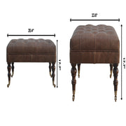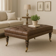 - Buffalo Ottoman With Castor Legs - Combining comfort and practicality, this ottoman is upholstered in 100% buffalo hide, radiating luxury and durability. Crafted from 100% solid mango wood, its sturdy construction harmonizes strength with elegant grains. Hand-turned feet, finished in light, add stability and artisanal charm. With a deep-buttoned top, it's both a statement of sophistication and a functional addition to your home.