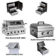 - 32" High-Performance Built-In Gas Grill: Equipped with four cast stainless steel burners plus an infrared rear burner, delivering up to 60,000 BTU of powerful, even heat.