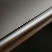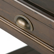 - Transitional design includes rounded molded table top, framed drawers, square,slightly tapered legs and antique bronze classic drawer pulls