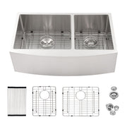 Double Bowl Sink 60 / 40 Split Apron Front Kitchen Sink In 16 Gauge With 2 10" Deep Basins 33" X21" X10" - Brushed Nickel