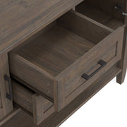 - Features two (2) drawers with metal drawer glides, two (2) cabinets and 1 (one) large open bottom shelf