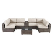 - Complete Outdoor Seating Group: Includes sectional chairs, corner pieces, center console with cup holders, and a glass-top coffee table