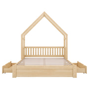 Queen Size House Platform Bed With Guardrail And 2 Drawers - Natural