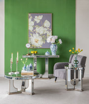 - Elegant Design: This dining table combines classic art with nature's beauty, featuring a large rectangular top with an alluring mirrored finish and lifelike floral motifs.