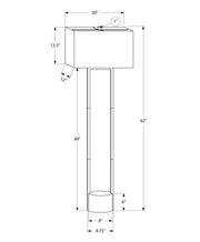 - Dimensions: Assembled size is 20 in. W x 12 in. D x 62 in. H; base is 8 in. L x 8 in. W x 6 in. H; and shade is 20 in. W x 12 in. D x 12.5 in. H.
