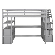 Full Size Loft Bed With Desk, Shelves, 2 Drawers, Storage Staircase - Gray
