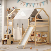 Twin Size Charming House Shaped Loft Bed With Tent And Slide - White / Pink