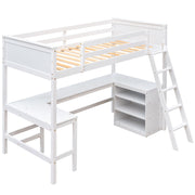 Twin Size Loft Bed With Shelves With Desk - White
