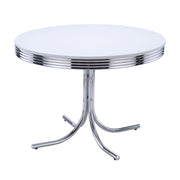 - Classic round table with chrome metal edge and white finish for timeless appeal