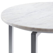 - Featues a round marble table top complemented by an X shaped stainless steel base