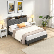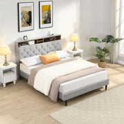 Modern Queen Size Upholstered Platform Bed Frame With Button Tufted Linen Fabric Headboard And USB Ports - Light Gray