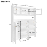 Multifunctional Tipping Bucket Shoe Cabinet With Storage Shelf & 6 Flip Drawers, Large Hall Tree With Tempered Glass Doors, Foyer Cabinet With 4 Hooks For Hallway - White