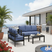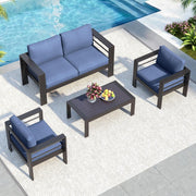 4 Piece Patio Conversation Set With Cushions And Powder Coated Frames, Loveseat, Armchairs, Coffee Table - Blue