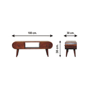 - Circular TV Unit - Our solid timber media unit is expertly constructed from 100% solid mango wood in a lovely finish. This modern circular design offers clean, curved edges and features 2 small drawers that come with a shiny knob, and a open slot to place any books, photo frames, ornaments, as well as 4 Nordic style legs.