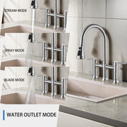 - 360° Swivel: The 3-hole bridge faucet allows comprehensive access to every corner of the sink, eliminating the need for a side-sprayer.