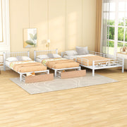 Multi-functional: This triple bed can be divided into three separate beds to meet your different needs. The shelf beside the upper bed and the table with a drawer between the two lower beds provide space for daily supplies within easy reach. The two pull-out drawers under the lower beds save space for storing clothes and toys.