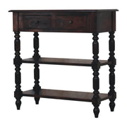 - Table Turned legs Artisan Furniture - Elevate your space with the Turned legs Table, a perfect blend of classic charm and practicality. Crafted from 100% solid mango wood in a rich finish, this table features compact drawers for discreet storage and open shelves for displaying decor or organizing essentials. The intricately turned legs lend a timeless, elegant appeal, making it an ideal addition to entryways, hallways, or living rooms. Combining durability with sophisticated design, the Turned legs Table is a versatile and stylish solution to enhance your home decor.
