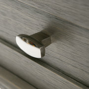 - Transitional design features brushed knob, square tapered legs and square edged table top