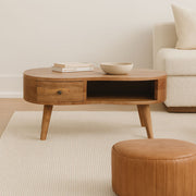 - Artisan Furniture Solid Wood Large Wave Coffee Table - This solid wood coffee table has been constructed from 100% solid mango wood in a finish and offers a unique shaped design with rounded edges. It features one open slot and one drawer with a shiny knob and Nordic-style legs. A great simple and add to the bedroom.