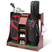 - Versatile Storage Capacity: This golf storage rack is designed with standard golf bag spaces and four open shelves, accommodating up to two golf bags and various other golf accessories such as balls, towels, shoes, and T-shirts.